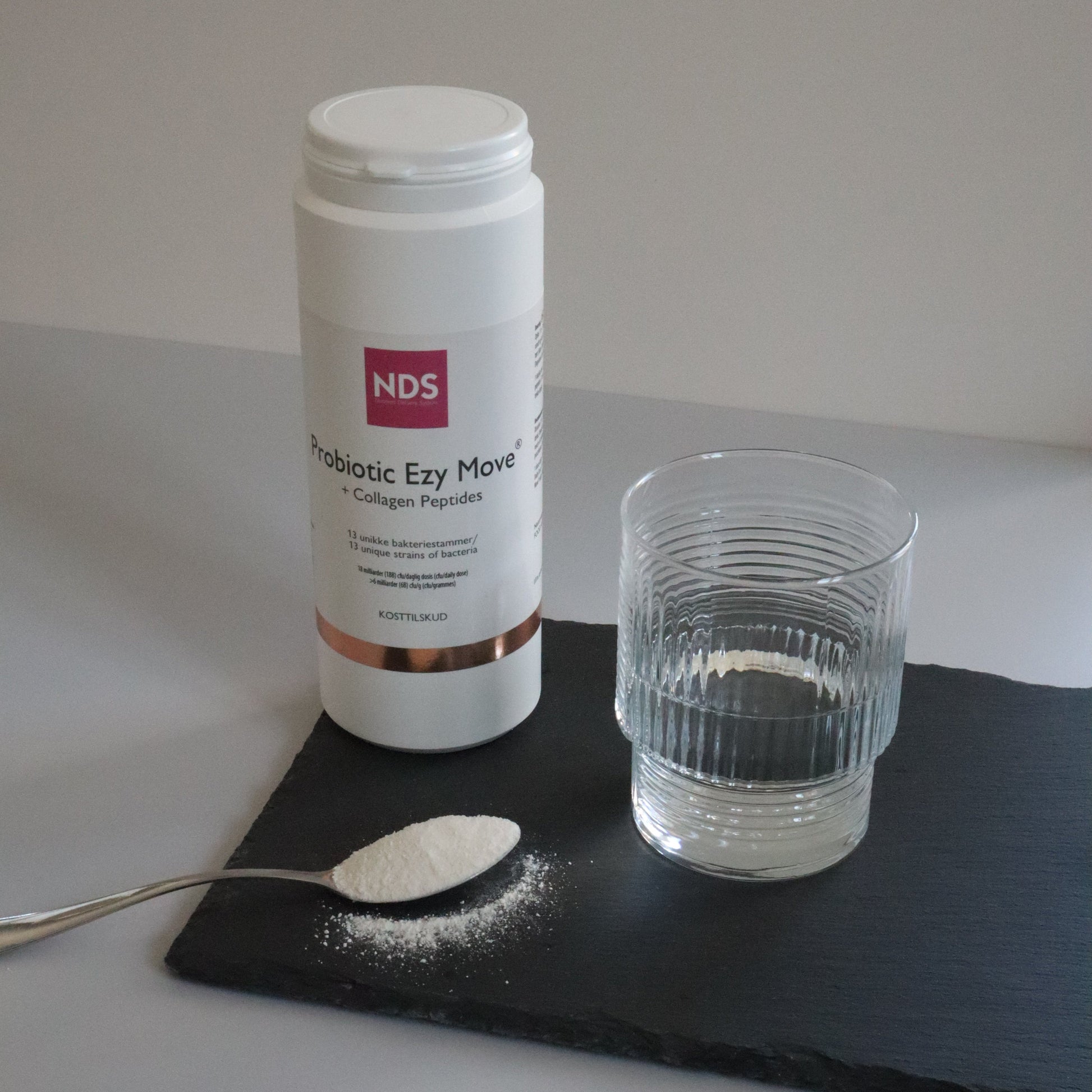 18.000.000.000 (18B) cfu daglig dosis (3 tsk.) og 5 gr. kollagen peptider (3 tsk.)